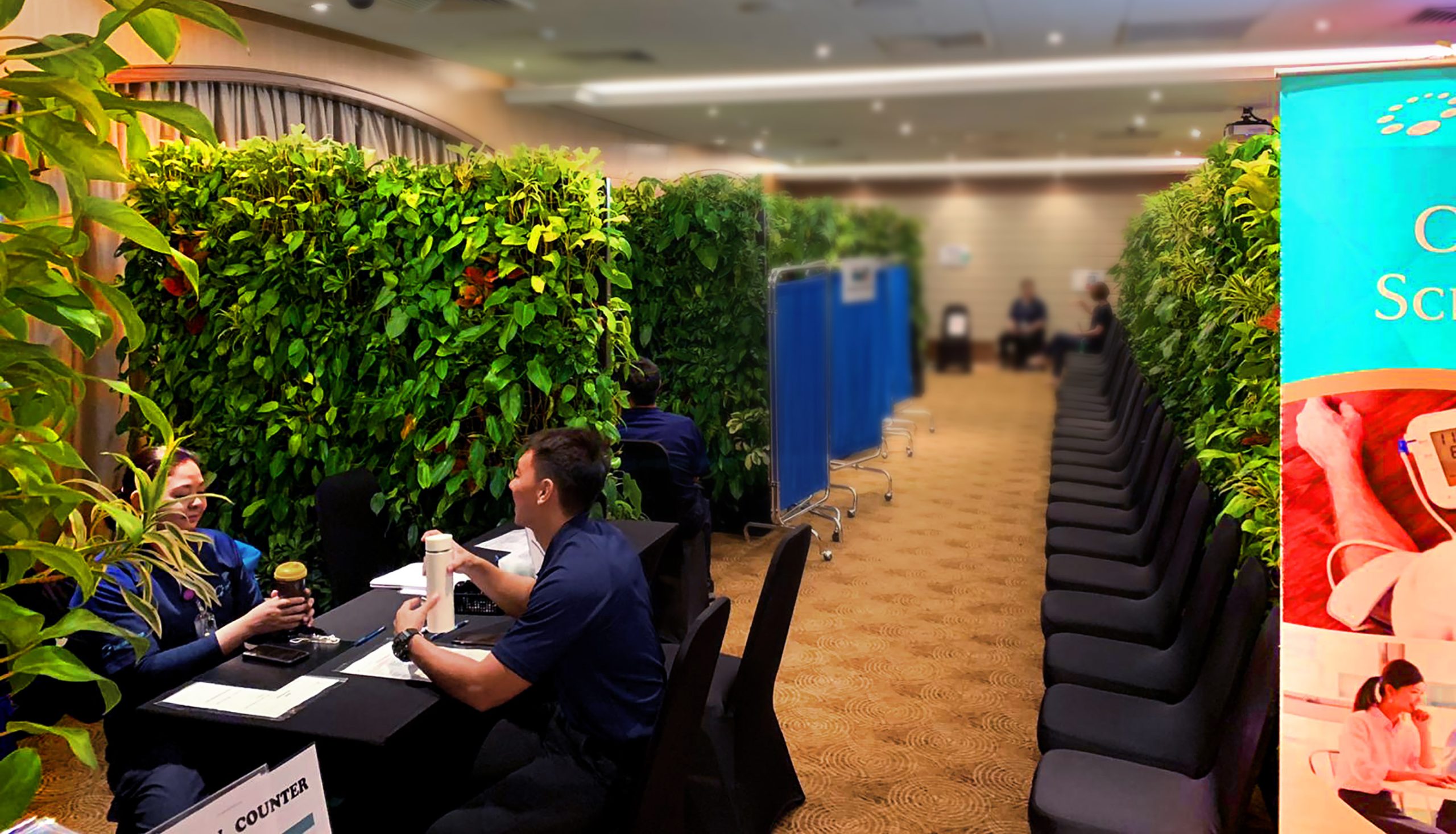 Firstly, the team realised a need to block out the exhibitors’ area from the main event hall. The reason is that some vendors will be conducting free medical screening and will not want to hamper participation because of a lack of privacy. Therefore, the team proposed to set up a line of natural green walls comprising various plants and fauna.